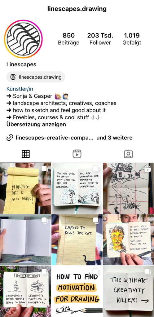 Mein absolutes Lieblingsprofil in dieser Hinsicht ist übrigens @linescapes.drawing. Ich fühle mich in den wunderbaren leichtfüßigen Illustrationen immer enorm verstanden, irgendwo zwischen großen Selbstzweifeln und Motivation, Prokrastination und kreativem Flowgefühl.