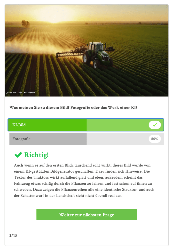 Beispiele: Ich finde das KI-Bilder-Quiz von Geo sehr empfehlenswert, da es zu jedem Bild erklärt, an welchen Details die KI-Generierung erkennbar ist. Mit Kindern könnte man jeden Tag oder am Wochenende gemeinsam ein Bild analysieren, z.B. als Frühstücksritual, nach dem Abendessen oder natürlich auch in der Schule.